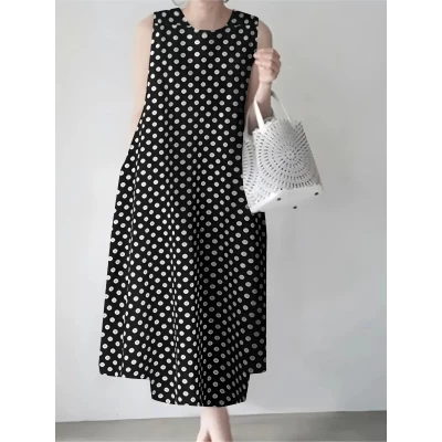 Polka dot crew neck dress, casual sleeveless loose dress for spring and summer, women's clothing